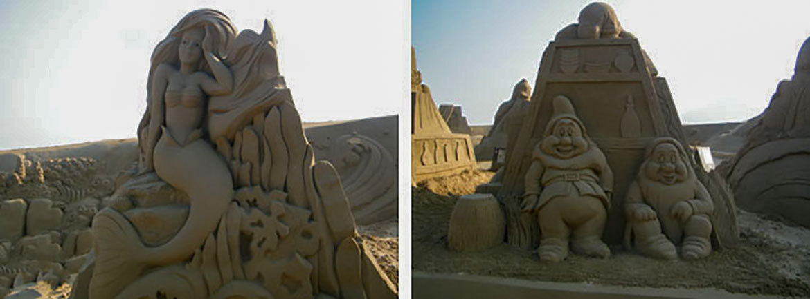 “沙雕故鄉(xiāng)、度假天堂”說得就是我們第一個(gè)到達(dá)的目的地:舟山朱家尖。朱家尖有清新、歡快的--海洋之旅;飄逸、灑脫的--休閑之旅;健康、明朗的--康體之旅。懷著這樣的憧憬,放下行李我們迫不及待的想去體驗(yàn)。果然,美輪美奐的沙雕景象,沖擊你的視覺體驗(yàn)。走進(jìn)以迪士尼卡通人物為主題的沙雕樂園里,帶你回到孩提時(shí)天真時(shí)代。現(xiàn)在就用照片跟大家一起分享我們的快樂。