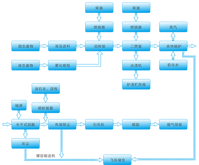主要焚燒設備:回轉窯+二燃室+余熱鍋爐+尾氣處理設備;